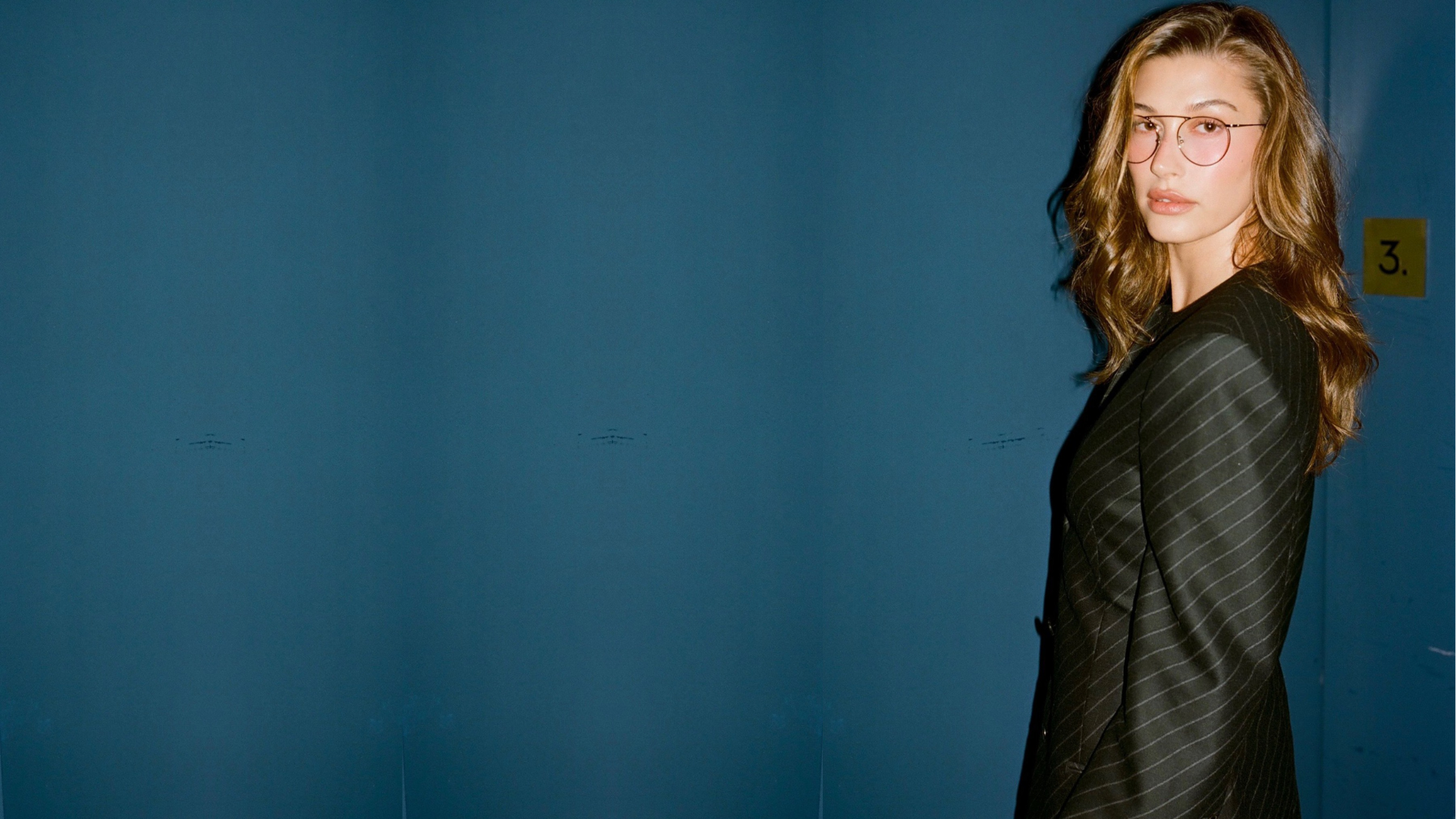 Hailey llevó el look 07 de la pasarela Calvin Klein Collection: un traje de falda de lana negra a rayas, sin cuello, acompañado de gafas redondas.