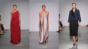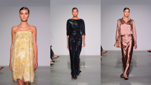 El juego de la transparencia y la fluidez se expresa en tejidos nobles —sedas, crêpes rosados, mallas ultrafinas— que bailan con la luz y dejan adivinar la piel como un secreto bien guardado.