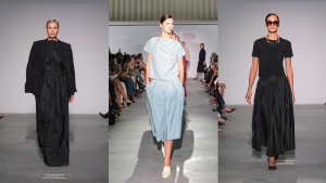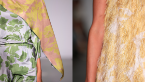 Sobre estas armonías se depositan flores como pétalos caídos al azar, estampados suaves, a veces sutilmente degradados, que recuerdan los rayos filtrados de una mañana de verano. Los volúmenes se despliegan en velos ligeros: vestidos sueltos ceñidos a la cintura con cinturón, faldas tipo paraguas aéreas y pantalones palazzo que rozan el tobillo.