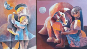 La exposición ofrece un recorrido por el universo figurativo de Quimbita, donde figuras humanas y animales se entrelazan en composiciones geométricas y cromáticas, expresando tanto la energía como la serenidad de la vida andina. “Somos seres duales, geométricos, de rostros azules y anaranjados como la naturaleza, alimentados por la fantasía”, señala el artista al describir la esencia de su obra.