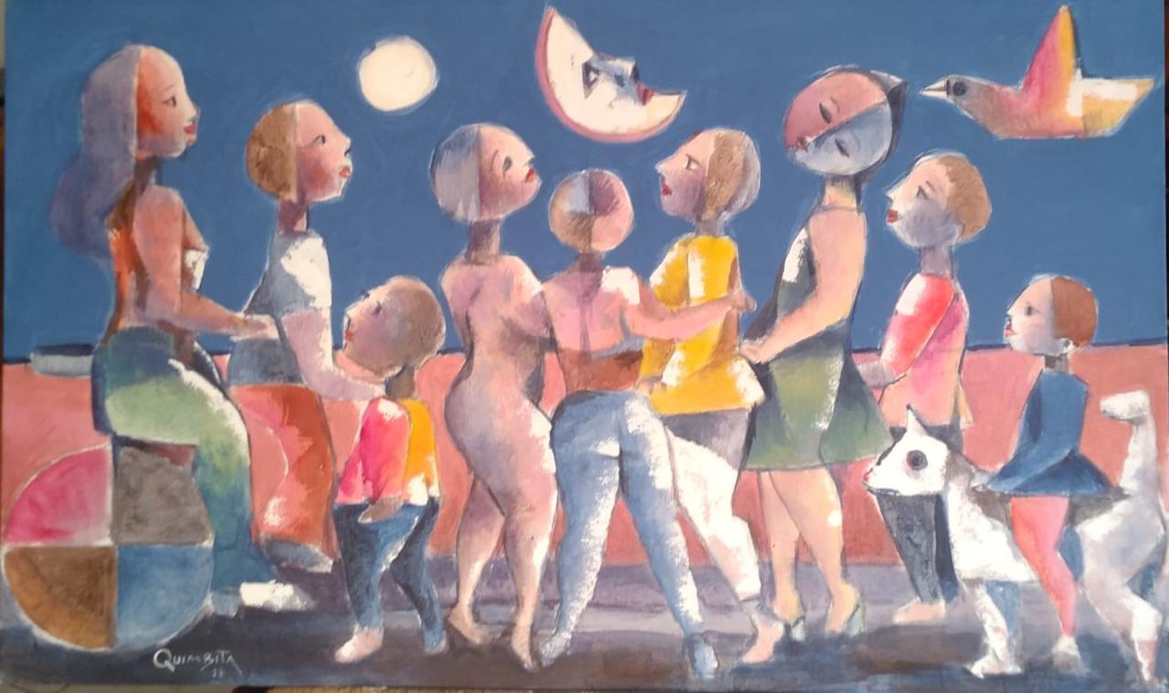 La exposición ofrece un recorrido por el universo figurativo de Quimbita, donde figuras humanas y animales se entrelazan en composiciones geométricas y cromáticas, expresando tanto la energía como la serenidad de la vida andina. “Somos seres duales, geométricos, de rostros azules y anaranjados como la naturaleza, alimentados por la fantasía”, señala el artista al describir la esencia de su obra.