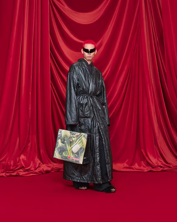 Completando la propuesta, pero ya dentro de la categoría de complementos, en la colección se incluye un nuevo modelo de bolso “Rodeo” con solapa, desde el que se entra a reinterpretar el diseño de lo que pudiera ser un “barato” bolso de plástico. Un nuevo guiño de Balenciaga y de Demna por la cotidianidad del día a día, que se enfatiza igualmente con las largas cadenas que adornan al mismo modelo, con diferentes “clutch” en forma de “stilettos” y zapatos de vestir, con nuevas versiones con frutas y verduras de su ya polémica bolsa tote bag, o con unas carteras de mano que se han diseñado a modo de pasaportes. Terminando ya en una categoría de calzado para la que se han presentado nuevos diseños de sandalias, de “stilettos” sin tacón, o una versión de zapatillas de su modelo “Cargo” en líneas oversize, de las que se han lanzado ya una edición limitada de 1.000 pares tras la celebración del desfile. Siendo todos estos diseños de calzado unos modelos que, siguiendo con el ánimo inclusivo de una colección en la que vuelven a desdibujarse los roles tradicionales de lo masculino y de lo femenino, estarán disponibles en una gama completa de tallas, tanto para mujeres como para hombres.
