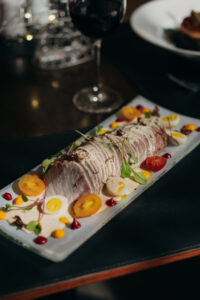 Para el 24 y el 31 de diciembre, el restaurante presenta una experiencia en formato buffet. La celebración inicia con una amplia mesa de fiambres, quesos artesanales y especialidades frías que sintetizan su identidad mediterránea. Porchetta, bresaola, jamón crudo serrano, mortadela con nueces y quesos Tomme, gorgonzola, camembert, ahumado y burrata conviven con opciones clásicas como vitello tonnato, lengua a la criolla y matambre casero, además de propuestas de mar.