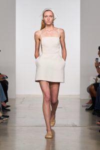 La ropa interior se convierte en protagonista, apareciendo en variaciones de la camiseta lencera y el vestido lencero, en detalles de encaje y correas para gafas, para luego estallar en un vestido de tweed sin costuras tejido con las icónicas bandas de cintura con logo de la marca. En la ropa, las siluetas van desde altas y esbeltas hasta cortas y reveladoras, pasando por sueltas y en capas, con un enfoque en la sastrería precisa, los drapeados fluidos y los detalles de flecos. Lanas a medida, tejidos técnicos lavados y encerados, jerséis y sedas líquidas se ofrecen en una paleta urbana de blancos, negros y grises, con toques de rosa, escarlata, azul claro y verde helecho. Los tejidos, especialmente los cueros, adoptan nuevas texturas táctiles: cortados con láser para parecer felpa, ensamblados en intarsia, cortados a mano y tejidos en vestidos de flecos al crochet.