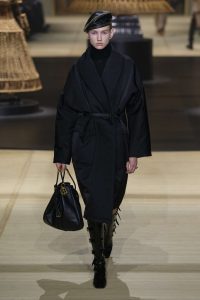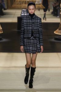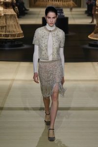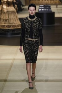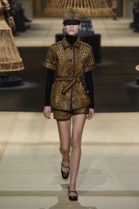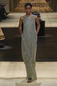 El desfile se llenó de dramatismo con una remezcla de la canción favorita de las pasarelas francesas Je t’aime moi non plus, de Serge Gainsbourg y Jane Birkin, cuando la acción pasó a la noche. Abrigos y chaquetas con estampado de guepardo; vestidos de flapper posmodernos con flecos y hermosas columnas de pedrería, de nuevo con un toque de los diseños de Crespi.