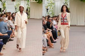 Los colores botánicos, especialmente el verde, se combinan con gracia en las prendas de punto, acompañados de tonos cálidos como el naranja y el rosado. Esta combinación crea una paleta de colores que evoca la delicadeza y feminidad de los pétalos de las flores, rindiendo además con sus formas homenaje a la elegancia atemporal.
