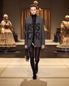 Y si de un lado tenemos toda esta suma de apuntes sobre los orígenes y sobre la historia de Dior y de su línea “Miss Dior” nuevamente como base de una nueva colección de la histórica casa parisina, del otro, y siguiendo del mismo modo con el discurso que proclama Chiuri desde su posición como creativa, y como mujer, nos encontraríamos ya con ese “descaro” de los tiempos posmodernos, que permite mantener la colección con un pie en ese pasado de la casa, y el otro en el presente más “estimulante” de la moda. Siendo en este caso una “pulsión” desde la que Chiuri viene a hacer referencia al “empoderamieto”, a través del vestir, del que hace buena gala la mujer actual. Una energía, una libertad y una independencia, que guarda como principal objetivo defender y reivindicar, tomando en esta ocasión como referencia a la artista y diseñadora industrial italiana Gabriella Crespi. Mujer que se descubrió, tanto ella como sus creaciones, como una fuete de inspiración constante para Marc Bohan, y que, aún contando con esa referencia, Chiuri ahora hace evolucionar y pone a dialogar con la figura y la obra de la india Shakuntala Kulkarni. Artista que en esta ocasión ha sido la responsable de “intervenir” el desfile de presentación de esta última colección femenina de Dior, con la creación de una instalación artística desde las que se exhibe una muestra de su trabajo; en concreto, extractos de su vídeo-performance “Juloos” (2016), y de su serie de esculturas realizadas en caña “Of bodies, armour and cages» (De cuerpos, armaduras y jaulas). Piezas desde las que justamente, y en línea con los ideales que siempre ha defendido Chiuri, Kulkarni explora la relación entre el cuerpo femenino y los espacios públicos y privados en los que se desenvuelve la mujer, construyendo un interesante discurso sobre cómo el cuerpo de la mujer sigue representando, por sí solo, un arma de lucha y de cuestionamiento personal, político y cultural. Cuestión justamente que viene a hilar con ese mismo origen de esta colección, y en cómo desde Dior se decidieron a brindar a la mujer de la nueva “armadura” desde la que librar su batalla por la libertad, a través del vestir, en los años 60 70, con el lanzamiento de aquella nueva y primera línea “Miss Dior” de prêt-à-porter.