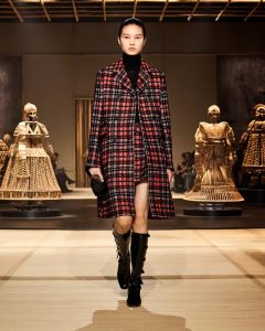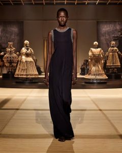 Igualmente resulta de necesidad no dejar de obviar el elevado tono con el que la colección fue cerrando su desfile de presentación, parte desde la que empezaron a desfilar sobre la pasarela tanto los abrigos y conjuntos en acabados en tartán de colores, con esos patrones en “A” tan propios de los años 60-70; como una distinta sucesión de prendas en acabado “animal print” de leopardo; ese conjunto en dorado de falda emplumada; distintas piezas y conjuntos de inspiración estilo “flapper”; y terminando ya con la presentación de una sucesión de vestidos largos, y especialmente singulares, desde los que Chiuri volvió a poner a dialogar esa herencia recibida de la línea “Mis Dior” de prêt-à-porter, con esa elegancia y con ese descaro sobre las que se eleva el conjunto de la colección. Unos últimos diseños que llamaron así poderosamente la atención, tanto por sus patrones de líneas limpias y depuradas, como por la tensión que se generaba al enfrentar esa sencillez, con el cuidado trabajo que desprendían sus intrincados bordados y primorosos acabados en efecto-joya.