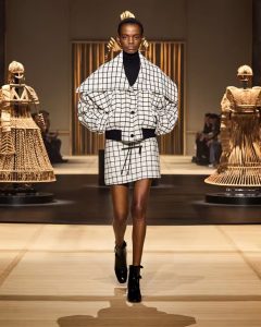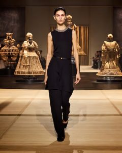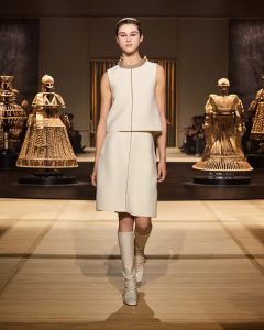 Y si de un lado tenemos toda esta suma de apuntes sobre los orígenes y sobre la historia de Dior y de su línea “Miss Dior” nuevamente como base de una nueva colección de la histórica casa parisina, del otro, y siguiendo del mismo modo con el discurso que proclama Chiuri desde su posición como creativa, y como mujer, nos encontraríamos ya con ese “descaro” de los tiempos posmodernos, que permite mantener la colección con un pie en ese pasado de la casa, y el otro en el presente más “estimulante” de la moda. Siendo en este caso una “pulsión” desde la que Chiuri viene a hacer referencia al “empoderamieto”, a través del vestir, del que hace buena gala la mujer actual. Una energía, una libertad y una independencia, que guarda como principal objetivo defender y reivindicar, tomando en esta ocasión como referencia a la artista y diseñadora industrial italiana Gabriella Crespi. Mujer que se descubrió, tanto ella como sus creaciones, como una fuete de inspiración constante para Marc Bohan, y que, aún contando con esa referencia, Chiuri ahora hace evolucionar y pone a dialogar con la figura y la obra de la india Shakuntala Kulkarni. Artista que en esta ocasión ha sido la responsable de “intervenir” el desfile de presentación de esta última colección femenina de Dior, con la creación de una instalación artística desde las que se exhibe una muestra de su trabajo; en concreto, extractos de su vídeo-performance “Juloos” (2016), y de su serie de esculturas realizadas en caña “Of bodies, armour and cages» (De cuerpos, armaduras y jaulas). Piezas desde las que justamente, y en línea con los ideales que siempre ha defendido Chiuri, Kulkarni explora la relación entre el cuerpo femenino y los espacios públicos y privados en los que se desenvuelve la mujer, construyendo un interesante discurso sobre cómo el cuerpo de la mujer sigue representando, por sí solo, un arma de lucha y de cuestionamiento personal, político y cultural. Cuestión justamente que viene a hilar con ese mismo origen de esta colección, y en cómo desde Dior se decidieron a brindar a la mujer de la nueva “armadura” desde la que librar su batalla por la libertad, a través del vestir, en los años 60 70, con el lanzamiento de aquella nueva y primera línea “Miss Dior” de prêt-à-porter.