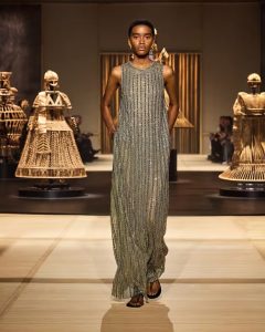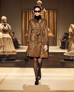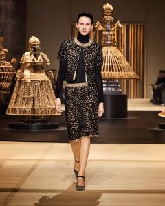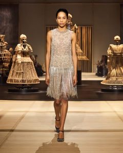 Igualmente resulta de necesidad no dejar de obviar el elevado tono con el que la colección fue cerrando su desfile de presentación, parte desde la que empezaron a desfilar sobre la pasarela tanto los abrigos y conjuntos en acabados en tartán de colores, con esos patrones en “A” tan propios de los años 60-70; como una distinta sucesión de prendas en acabado “animal print” de leopardo; ese conjunto en dorado de falda emplumada; distintas piezas y conjuntos de inspiración estilo “flapper”; y terminando ya con la presentación de una sucesión de vestidos largos, y especialmente singulares, desde los que Chiuri volvió a poner a dialogar esa herencia recibida de la línea “Mis Dior” de prêt-à-porter, con esa elegancia y con ese descaro sobre las que se eleva el conjunto de la colección. Unos últimos diseños que llamaron así poderosamente la atención, tanto por sus patrones de líneas limpias y depuradas, como por la tensión que se generaba al enfrentar esa sencillez, con el cuidado trabajo que desprendían sus intrincados bordados y primorosos acabados en efecto-joya.