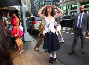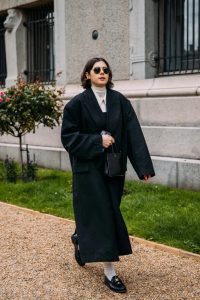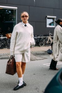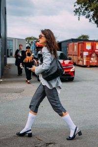Si hay un combo que se repite entre las celebrities, ese es el de mocasines con calcetines (incluso deportivos), un truco de estilismo que todo buen paninari lució en los años 80 y que se ha convertido en epítome del estilo clásico. Lo más habitual es verlo con mocasines negros, como los del efecto moneda de Miu Miu, siempre en looks de aire colegial. Unos pantalones cortos, una camisa blanca y una corbata se llevan muy bien con ellos. También conjuntos de superposiciones que restringen la paleta cromática a tonos como el blanco y el azul marino. De todos modos, el street style deja claro que se pueden llevar a su vertiente opuesta: combinarlos con unos zapatos masculinos y hacerlos contrastar con una falda vaquera y una blusa romántica con volantes.