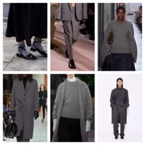 El gris adquiere un carácter racional y elegante en pantalones de corte perfecto, abrigos con espiga y prendas de punto. También menciona que el color es elegante para los detalles, como un calcetín gris combinado con “un tacón”, unos guantes largos o unas bragas de punto para salir (al estilo Miu Miu).