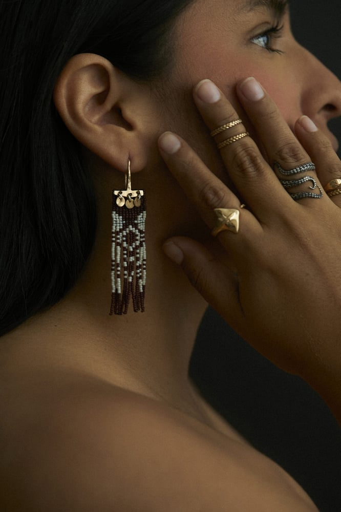 Firme en su compromiso de preservar y reinterpretar los códigos precolombinos, la creativa peruana ha encontrado en la naturaleza y en la sabiduría ancestral la fuente de inspiración para su trabajo, incluyendo en su nueva propuesta piezas hechas de plata, bronce, cuentas y mostacillas que representan animales lunares, alacranes, serpientes bicéfalas, cangrejos, camarones, arañas, cóndores, peces, rayas y búhos, por mencionar algunos.