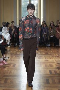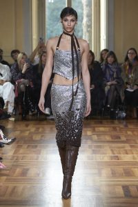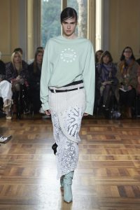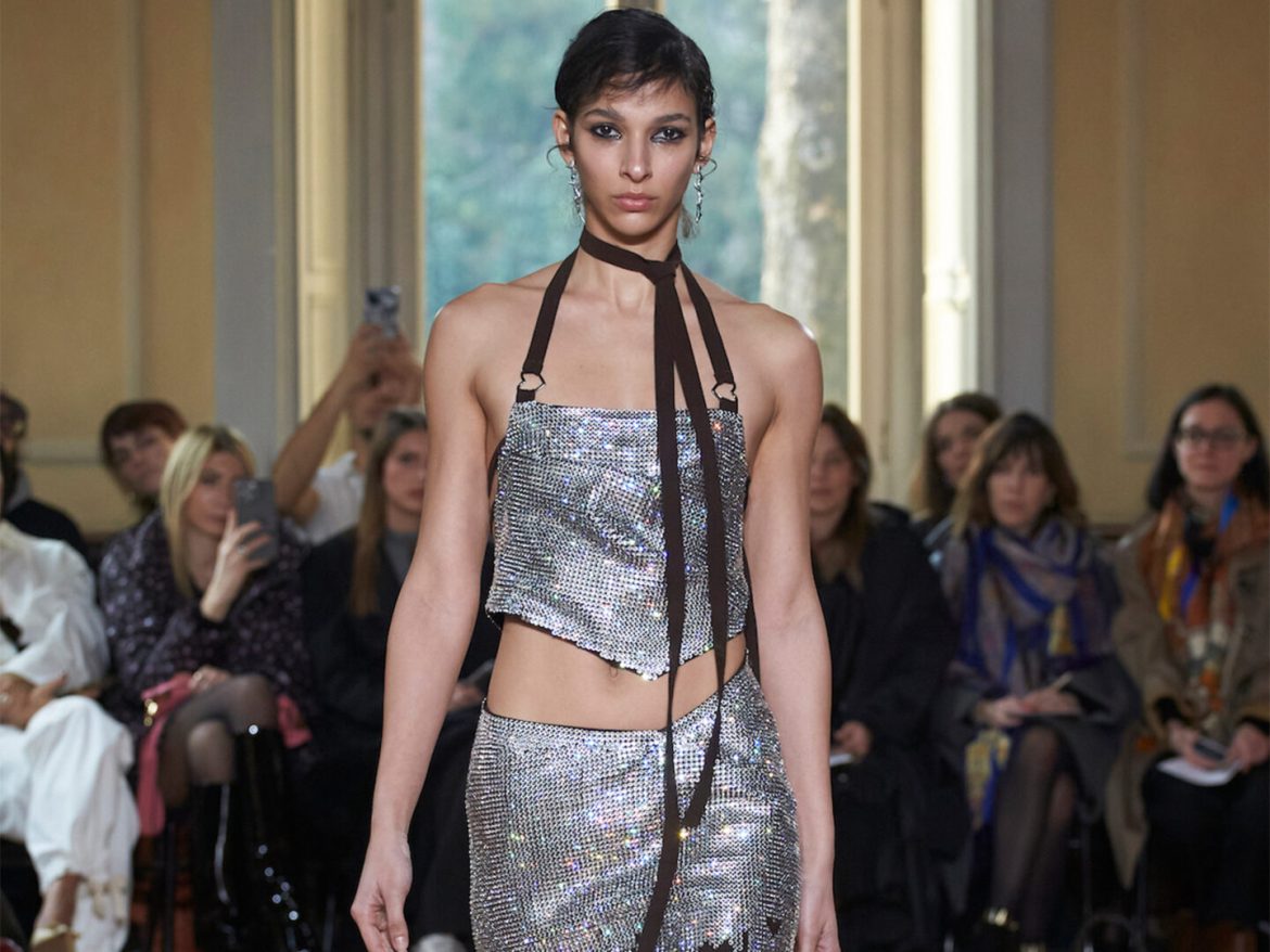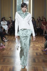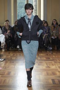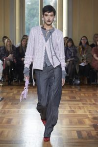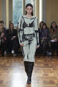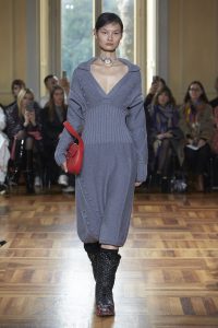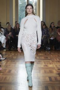 Realzando todavía más el romanticismo de su propuesta, Marco Rambaldi ha cubierto con corazones sus nuevos diseños y los rescatados de los archivos como la bomber sin mangas revisada en lana, denim y cuero o el vestido con cordones. Además, encontramos diversos trampantojos en forma de prendas de punto, que engañan a la vista haciendo creer que los cuerpos parezcan semi desnudos cuando en realidad el punto y la alpaca lo cubren y abrigan con formas recargadas.