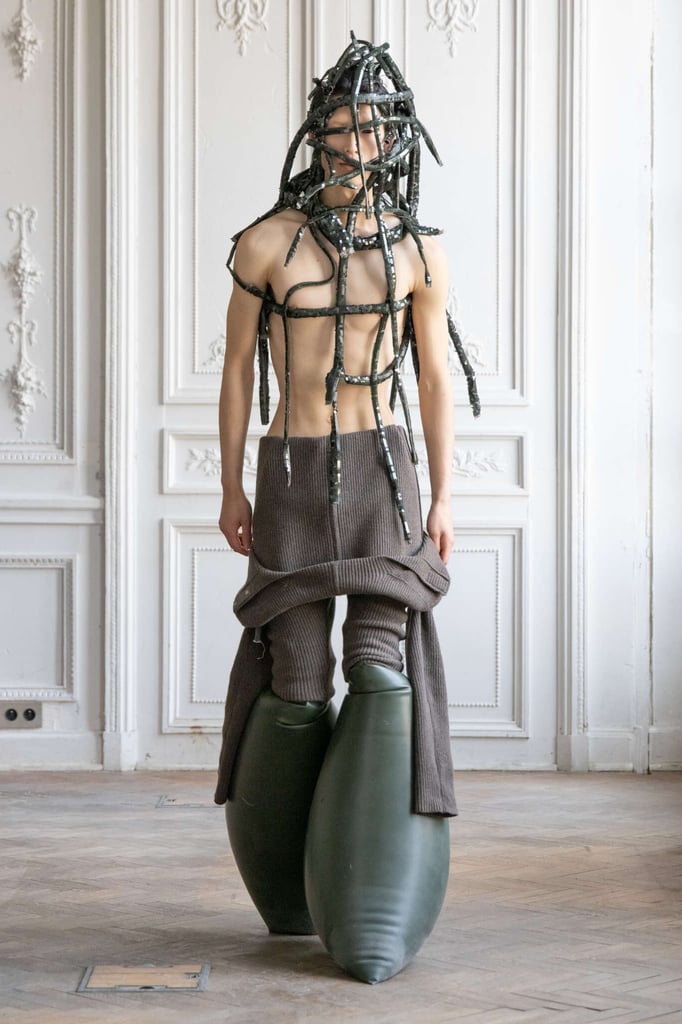 Turbante estilo Rudolf Nureyev en Dior, pañuelo con cascadas de pelo rizado en trampantojo en Givenchy, gorro de baño en Prada, sombrero de vaquero en Louis Vuitton, chapka en Winnie, por no mencionar las innumerables versiones de pasamontañas. Magliano reinterpreta el Borsalino como un sombrerito para las fiestas. Bluemarble destaca con un gigantesco sombrero de piel sintética, mientras que Walter Van Beirendonck vuelve a proponer algunos modelos XXL de sus archivos, de la mano del famoso sombrerero Stephen Jones.