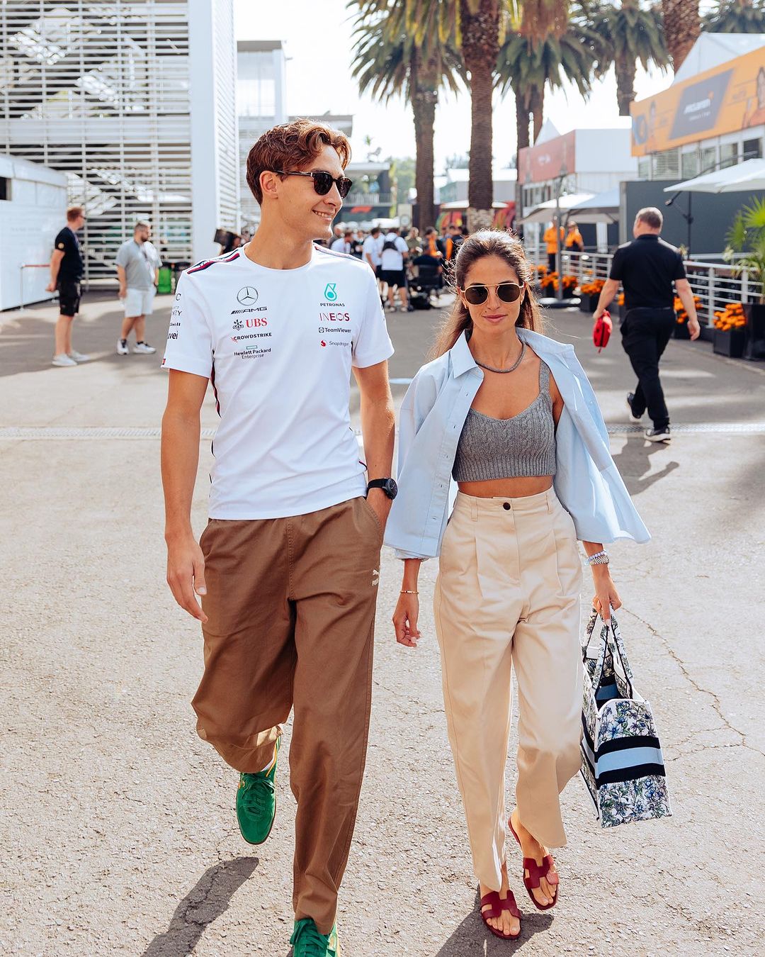 George Russell lució un jersey de punto con rayas globales, camisa mitad tartán y mitad denim, jeans y zapatillas de cuero de la colección Otoño 2023 de TOMMY HILFIGER.