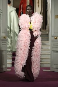 Pieles exóticas, peletería y plumas modeladas y esculpidas a base de tejidos y técnica, rouleaux de organza de seda y lentejuelas cortadas a mano: 1.000 horas de trabajo solo para dar vida al abrigo de mohair color mostaza y el vestido bustier drapeado en rosa fucsia; 87 metros de tela para la capa de rosas rojas de seda; 415 horas para confeccionar el chaleco rosa pálido; 590 para el vestido de tul, crepé de seda y gazar con incrustaciones de encaje Chantilly dentelle… Y estas son solo algunas de las abultadas cifras de la alta costura. En un juego de contrastes, la extrema fragilidad de lo precioso se convierte en fuerza, la yuxtaposición de opuestos se transforma en flujo incesante de energía y lo intangible adquiere una materialidad sensorial, con una inmediatez y espontaneidad habitualmente ajenas a gestos premeditados. «Es un lugar destinado a ser testigo de la belleza y, por tanto, a experimentar la humanidad», se lee en el cuadernillo reservado a los invitados sobre una propuesta cuya principal misión es rendir culto a la artesanía. Porque estas prendas solo pueden contemplarse con la admiración y la mirada atenta con que nos perderíamos en una obra de arte.