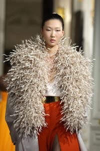 Antes que el director creativo, cuando llegó el final del desfile fueron las premiers, sastras y patronistas, las personas que confeccionan y bordan, quienes recibieron los aplausos sobre la pasarela. Antonietta De Angelis, Floriana Livrieri, Alessandra Martini, Irene Stranieri, Debora Zampa y Laura Dalla Valle: son ellas quienes dirigen los seis ateliers que hacen tangible el savoir faire. El tejido, pensado y plasmado a modo de joya que envuelve el cuerpo, acaparó la atención. Rosas rojas tridimensionales, plumas de lentejuelas, pétalos metálicos, espirales de cuero grabado, velos de encaje como pintados, nubes de flecos con la densidad del coral o espinas de organza, creadas con el ingenio y la dedicación reservados a las grandes obras artísticas.