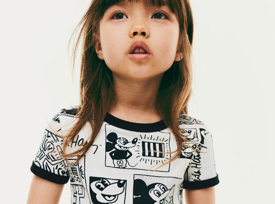 H&M presenta su nueva colección infantil, basada en las clásicas interpretaciones del artista estadounidense Keith Haring sobre el emblemático personaje de Disney. La línea incluye ropa y accesorios con estampados y diseños estilo collage en tonos rojo, blanco y negro, acompañados de un azul denim claro. Con un estilo urbano, esta colección ofrece casacas de béisbol y denim, polos y vestidos tipo overol, combinando arte y moda en siluetas amplias y modernas que se convertirán en las prendas favoritas de los pequeños para el verano 2025.