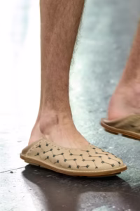 El retorno al saber hacer artesanal respetada se manifiesta en técnicas como el tejido, el trenzado y el bordado. Las siluetas clave incluyen sandalias de cuero trenzado, sandalias de senderismo con tiras tejidas y slip-ons bordadas. El tejido se extiende al cuero de plena flor, elaborado en empeines calados, o a las mezclas de cáñamo y algodón que crean cintas y lazos para los detalles. Hebras de cuentas talladas se superponen en el calzado de inspiración activa, mientras que el trenzado de yute, una hierba natural con siglos de antigüedad, da lugar a suelas de alpargatas.
