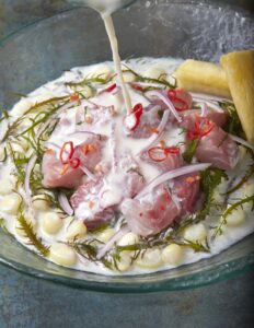 1.- Ceviche Camino al Norte: Cabrilla fresca, leche de tigre norteña, choclo, yuyo, yuca sancochada, cebolla roja y ají limo en rodajas.