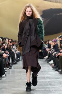 Con una paleta que oscila entre tonos neutros y detalles inesperados, Sacai presenta una colección que, lejos de caer en lo convencional, celebra la ambigüedad y la versatilidad. Las prendas son una fusión de estilos, donde lo técnico se encuentra con lo artesanal, lo formal con lo deportivo, creando looks que desafían los límites de la moda y muestran una estética contemporánea pero atemporal.