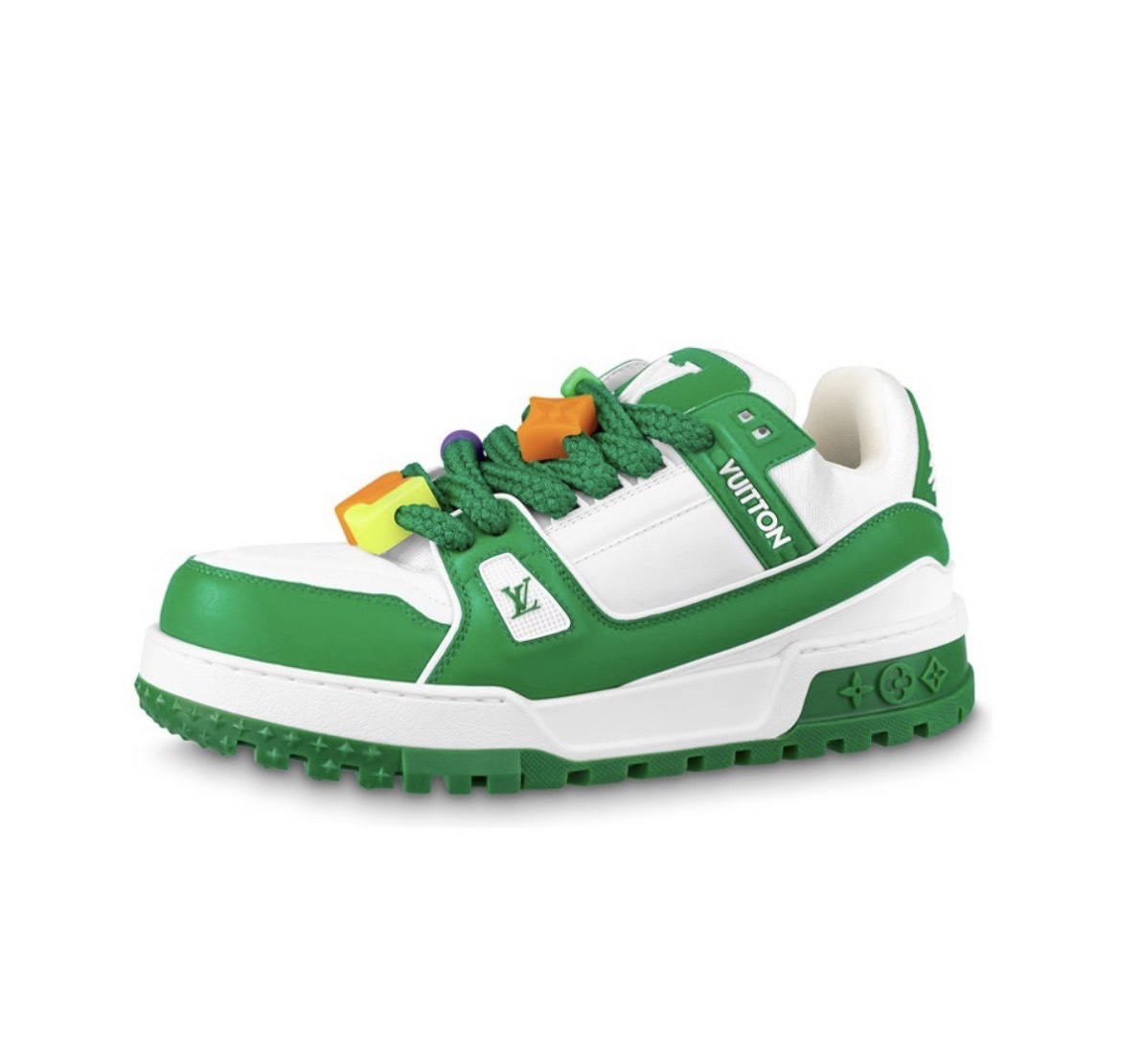 Bautizada como LV Trainer Maxi Sneaker, la nueva versión mantiene los detalles tradicionales del modelo, como su sencillo diseño bicolor, las lengüetas de goma y la marca en la puntera. La parte superior es de piel de ternero lisa con detalles superpuestos, escoltada por marcas lineales en las lengüetas traseras. Las letras «VUITTON» aparecen en la lengüeta, el lateral y en la parte central, mientras que los cordones, que siguen la nueva tendencia de ser gruesas cuerdas estilo cabo marinero, le otorgan el aspecto juvenil y similar a un juguete que Abloh siempre buscaba en sus colecciones. A eso se suman los adorables adornos florales del monograma de Louis Vuitton sobre las lengüetas hinchadas en tonos amarillos, naranjas, verdes y morados. Las gruesas entresuelas dentadas de gomas completan el diseño.